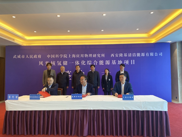 3月10日上午,在河西走廊重鎮(zhèn)——武威,中國科學(xué)院上海應(yīng)用物理研究所、甘肅省武威市人民政府、西安隆基清潔能源有限公司就一體化綜合能源基地示范項(xiàng)目進(jìn)行了研討與交流。三方共同簽訂了一體化綜合能源基地示范項(xiàng)目合作框架協(xié)議,致力于構(gòu)建新型現(xiàn)代能源示范體系。武威市委書記柳鵬,市委副書記、市長(zhǎng)周偉,市委常委、常務(wù)副市長(zhǎng)王國斌,上海應(yīng)物所所長(zhǎng)戴志敏,所務(wù)委員王建強(qiáng),西安隆基清潔能源有限公司董事長(zhǎng)張長(zhǎng)江等出席了簽約儀式。?