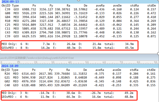 圖2 2024年9月13日和10月9日的計(jì)算結(jié)果均表明,通過觀測(cè)中高軌GNSS衛(wèi)星站點(diǎn)的定位精度均優(yōu)于50米