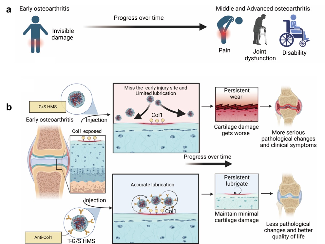 骨關節(jié)炎(OA)是一種退行性骨關節(jié)疾病,會導致疼痛、功能障礙和永久性關節(jié)損傷,并且目前病情發(fā)展被認為是不可逆的。因此,在OA早期進行及時治療并延緩其進一步發(fā)展具有重要意義。OA的重要病因之一是關節(jié)間潤滑缺失,然而由于OA早期病灶微小,現(xiàn)有的生物潤滑劑難以精準地靶向小面積的炎癥病灶,無法有效地防止進一步的軟骨損傷。
