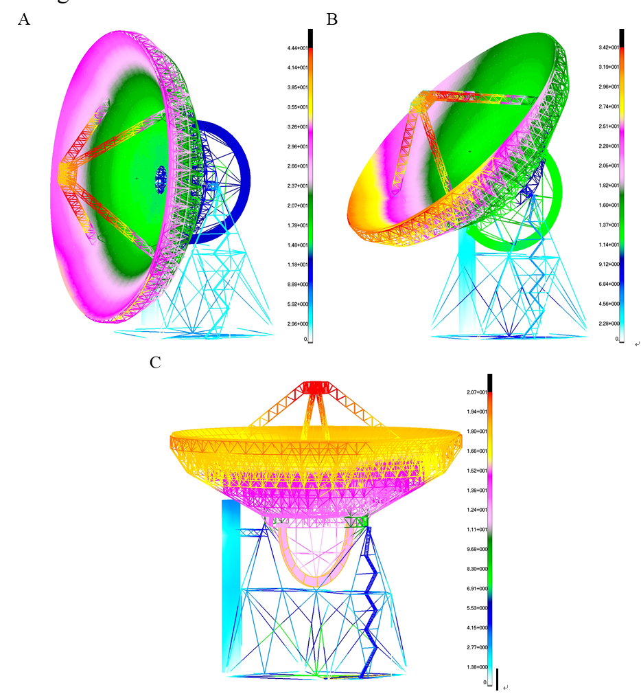 付麗、李旺、王玲玲等的論文介紹了風(fēng)載荷對天線指向精度影響的實(shí)驗(yàn)研究。主要內(nèi)容為:風(fēng)載荷具有瞬時(shí)性和紊亂性的特點(diǎn),其作用在天線結(jié)構(gòu)上會產(chǎn)生隨機(jī)誤差,對于高頻觀測,此項(xiàng)影響不可忽略。以天馬望遠(yuǎn)鏡為研究對象,基于搭建的結(jié)構(gòu)振動(dòng)測量系統(tǒng),對風(fēng)載荷引起的天線指向誤差展開實(shí)驗(yàn)研究。首先以天線結(jié)構(gòu)自振頻率范圍為參考,通過帶通濾波法獲得有用信號;再基于快速離散傅里葉變換方法過濾直流分量,最小二乘法擬合加速度進(jìn)行基線矯正;最后通過離散累加梯形面積方法近似求解加速度積分,經(jīng)過二次積分得到天線的結(jié)構(gòu)振動(dòng)位移,副面的位移減去饋源的位移得天線在光軸方向的位移,從而可以計(jì)算出天線的俯仰與方位指向誤差。在風(fēng)速為3.2m/s,天線俯仰角為61.7°,風(fēng)向角為80°時(shí),產(chǎn)生的俯仰指向誤差為3.05角秒,方位指向誤差為1.14角秒,與有限元分析和傾斜儀測量結(jié)果吻合,證明提出的信號處理方法和指向誤差計(jì)算方法的正確性。研究方法及數(shù)據(jù)分析結(jié)果為進(jìn)一步風(fēng)致指向誤差修正提供依據(jù)。