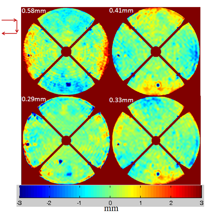 通過反復(fù)測量和調(diào)整的迭代方法,使面形逐漸逼近理想狀態(tài)。面形的改善過程見下圖,圖中扣除了副面和撐腿的遮擋部分。由于天氣和風(fēng)等環(huán)境因素對測量的影響,每次調(diào)整主面后,需要進(jìn)行驗(yàn)證測量。通過對天馬望遠(yuǎn)鏡的面形測量分析,進(jìn)行了多輪測量與調(diào)整,該望遠(yuǎn)鏡在53度俯仰角實(shí)現(xiàn)了0.28 mm RMS的面形誤差,且在Ka頻段的天線效率由37%提升至56%。此外,還在其他俯仰角度上應(yīng)用了離焦全息法和波前擾動(dòng)法,證實(shí)了這些模型在更廣俯仰范圍內(nèi)的效率改善能力,尤其是在低俯仰角和高俯仰角上分別提升了約1.3倍和1.6倍的效率。