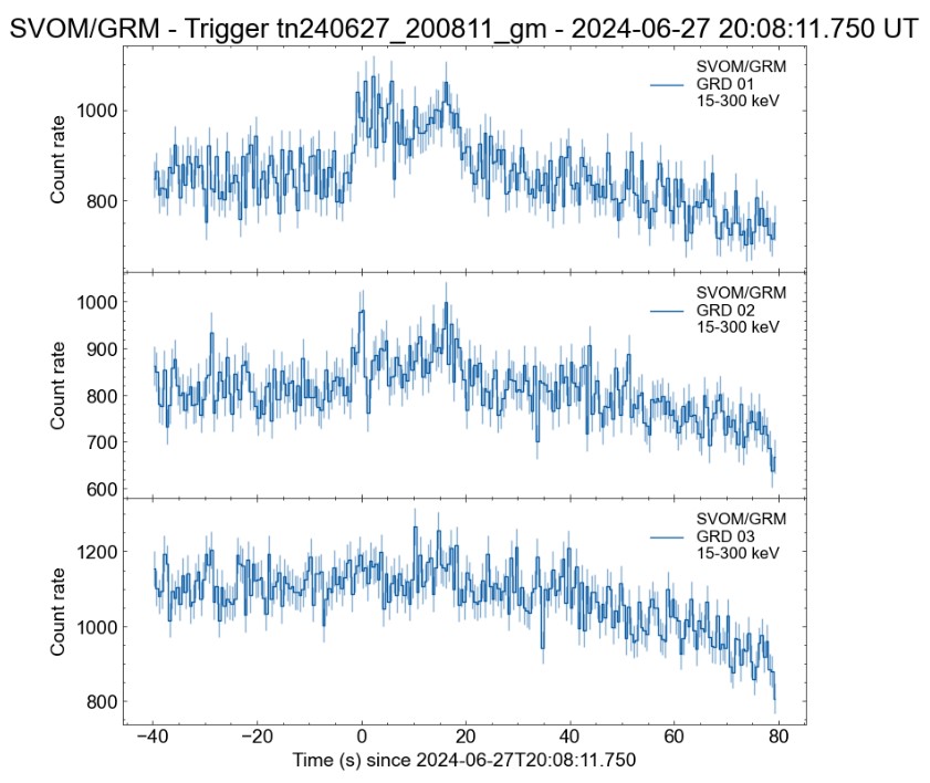 GRM載荷三臺(tái)探測器對(duì)GRB 240627B的光變曲線