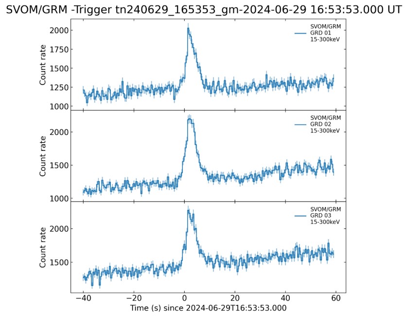 27日當(dāng)天20時(shí)8分11秒(UTC時(shí)),GRM就成功捕捉到首個(gè)伽馬射線暴(編號(hào)GRB 240627B),這是SVOM衛(wèi)星的首個(gè)在軌科學(xué)探測成果。經(jīng)過比對(duì),該伽馬暴的光變曲線與我國創(chuàng)新X首發(fā)星上所搭載的GECAM-C探測器所觀測到的結(jié)果相同,也和國外費(fèi)米衛(wèi)星GBM探測器的觀測結(jié)果高度一致。