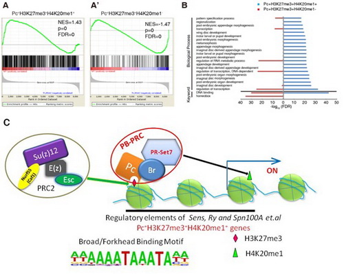 在趙允研究員和魏剛研究員的指導(dǎo)下,博士研究生呂向東和韓志軍等采用ChIP-seq和RNA-seq等實(shí)驗(yàn)技術(shù)方法,結(jié)合模式生物果蠅的遺傳學(xué)優(yōu)勢(shì),通過研究發(fā)現(xiàn)逐級(jí)招募的PcG蛋白通過調(diào)控一系列發(fā)育關(guān)鍵因子上的H4K20me1修飾(由甲基轉(zhuǎn)移酶PR-Set7催化)而直接正向調(diào)控這一類基因的轉(zhuǎn)錄。生物信息學(xué)分析也發(fā)現(xiàn)PcG蛋白正向調(diào)控Pc+H3K27me3+H4K20me1+ 基因的轉(zhuǎn)錄,而抑制Pc+H3K27me3+H4K20me1- 基因的轉(zhuǎn)錄。更為重要的是,通過實(shí)驗(yàn)證明轉(zhuǎn)錄因子Broad (Br)特異性結(jié)合Pc+H3K27me3+H4K20me1+ 基因而并非Pc+H3K27me3+H4K20me1-基因。該研究闡明了在機(jī)體正常發(fā)育過程中,Pc通過與PR-Set7以及Br相互結(jié)合形成大的復(fù)合物從而特異性地正向調(diào)控具有Pc+H3K27me3+H4K20me1+ 特征的一類基因轉(zhuǎn)錄的新功能和新機(jī)制。