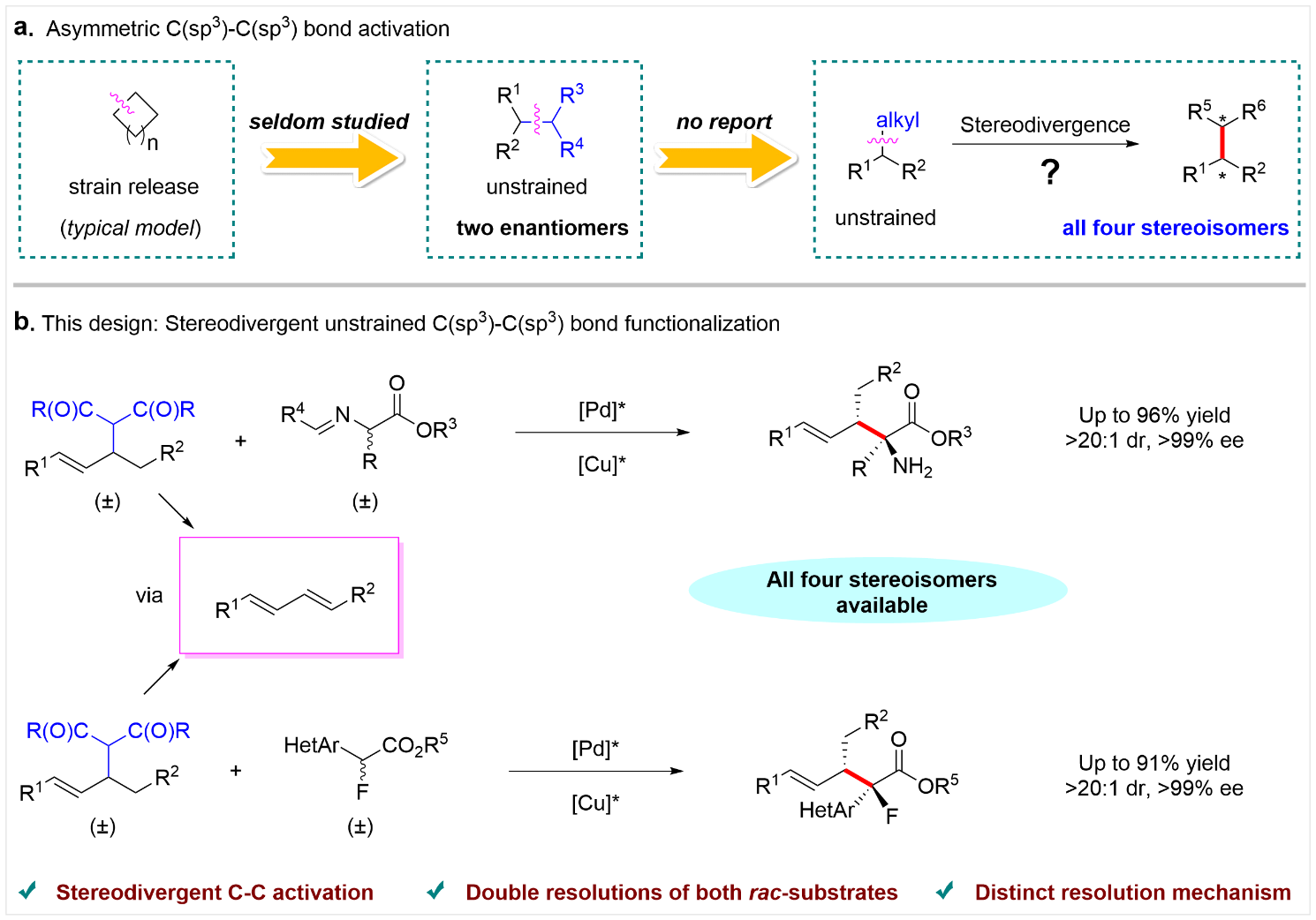 從相同底物出發(fā),通過(guò)立體發(fā)散性合成獲取目標(biāo)分子所有構(gòu)型的轉(zhuǎn)化方法,近年來(lái)引起了廣泛關(guān)注。目前,基于烯丙位雜原子離去基和不飽和烴的立體發(fā)散型合成有較多的探索。相比之下,同時(shí)斷裂非張力烷基碳-碳鍵并精確調(diào)控雙立體中心的合成具有較高的挑戰(zhàn)性,尚未有研究報(bào)道(圖1)。近日,金屬有機(jī)化學(xué)全國(guó)重點(diǎn)實(shí)驗(yàn)室何智濤課題組在Angew. Chem. Int. Ed. 上在線發(fā)表了題為 “Stereodivergent Alkylation of Unstrained C(sp3)-C(sp3) Bonds”的研究論文。該工作報(bào)道了一種金屬/配體調(diào)控的立體發(fā)散合成策略,通過(guò)消旋的烯丙基底物與消旋的氨基酸酯或氟代吡啶酯間的反應(yīng),同時(shí)制備了四種立體構(gòu)型的產(chǎn)物。非張力烷基碳-碳鍵的立體發(fā)散性轉(zhuǎn)化展現(xiàn)出良好的反應(yīng)活性、對(duì)映選擇性和非對(duì)映選擇性控制效果。不同于傳統(tǒng)的去消旋化觀點(diǎn),一系列機(jī)理實(shí)驗(yàn)表明,該反應(yīng)是通過(guò)共軛二烯中間體的形成來(lái)實(shí)現(xiàn)消旋底物的高效去消旋化。