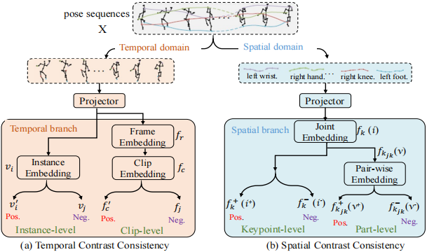 為此,團(tuán)隊(duì)提出了一個(gè)高效的層次化對(duì)比一致性約束(HICCON),能夠靈活嵌入多種姿態(tài)估計(jì)模型中,提升2D姿態(tài)估計(jì)性能。該方法在空間域上建模關(guān)鍵點(diǎn)與身體部件之間的關(guān)系,在時(shí)間域上捕捉幀與片段之間的運(yùn)動(dòng)模式。HICCON分別從空間與時(shí)間兩個(gè)維度提取多層次特征——包括關(guān)鍵點(diǎn)級(jí)、部件關(guān)系級(jí)、實(shí)例級(jí)和片段級(jí)等不同粒度,并施加對(duì)比學(xué)習(xí)約束,增強(qiáng)模型對(duì)復(fù)雜姿態(tài)的判別能力。實(shí)驗(yàn)表明,在主流視頻姿態(tài)數(shù)據(jù)集PoseTrack上,結(jié)合HICCON的多個(gè)模型均顯著超過基準(zhǔn)性能。本方法也表明了對(duì)比學(xué)習(xí)機(jī)制在人體視覺表征建模中的應(yīng)用潛力和重要作用。