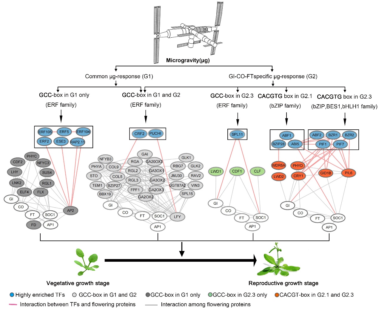 近日,中國科學(xué)院分子植物科學(xué)卓越創(chuàng)新中心科研團(tuán)隊(duì)報(bào)道了我國空間站空間微重力作用于植物開花的實(shí)驗(yàn)結(jié)果。研究發(fā)現(xiàn),植物在轉(zhuǎn)錄水平上對微重力的響應(yīng)包括GI-CO-FT模塊特異性和非特異性兩條途徑。GI-GO-FT特異性響應(yīng)微重力,經(jīng)由ERF、bZIP、bHLH和BES1轉(zhuǎn)錄因子共同調(diào)控的GCC-和CACGTG-元件,調(diào)控開花途徑關(guān)鍵基因的表達(dá),進(jìn)而改變GI-GO-FT模塊中關(guān)鍵基因的表達(dá),導(dǎo)致植物對微重力的響應(yīng)發(fā)生改變。